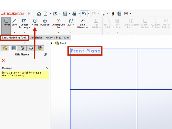 Create a new Circle. Since you completed the previous sketch+extrusion SolidWorks will ask you to select a planar face for your new sketch (circle). Click the broad face of your arm to select this face to use for your new sketch.